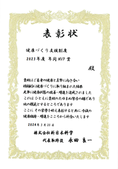 1年間を通じて、全社員の模範となるような素晴らしい健康づくりを行った社員をMVPとして選定・表彰し、その取組内容を全社員に紹介する。